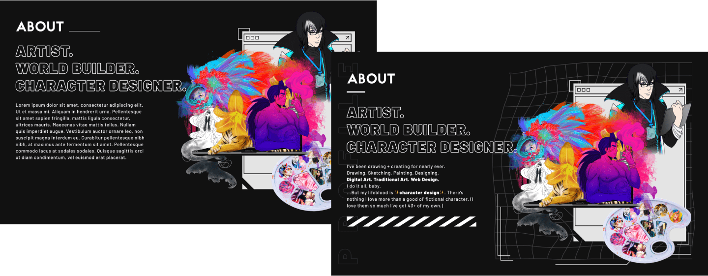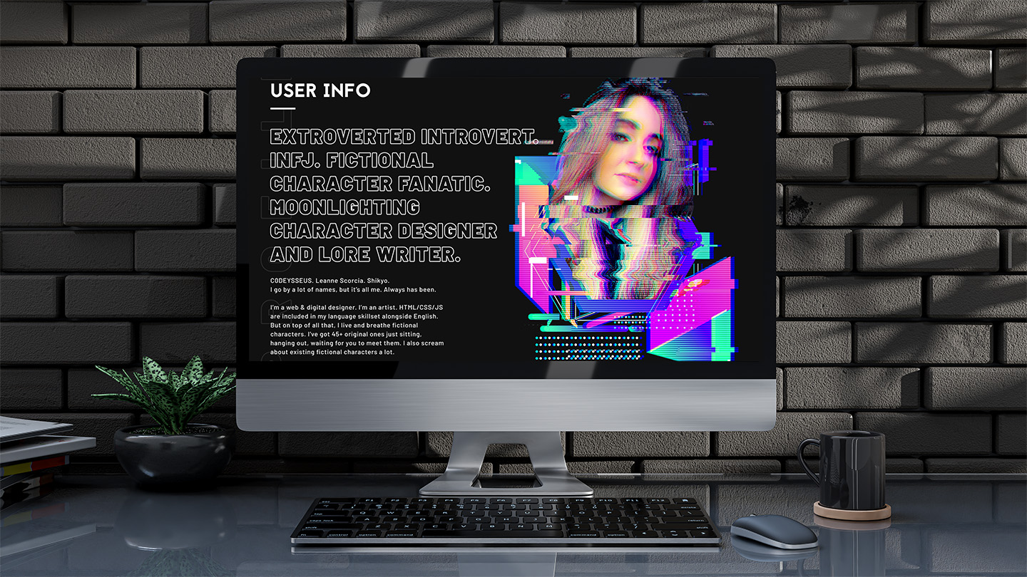 As a designer and a creative, I'm constantly pushing myself to new limits and to develop new ideas. When I'm not working my 9–5, I'm pouring my heart and soul into a video game concept that's been in development for the past 13+ years. Part of that creative journey has included the development (and devotion) to an entire subsection of my art & design, creative portfolio — an online presence I've established as C0DEYSSEUS.