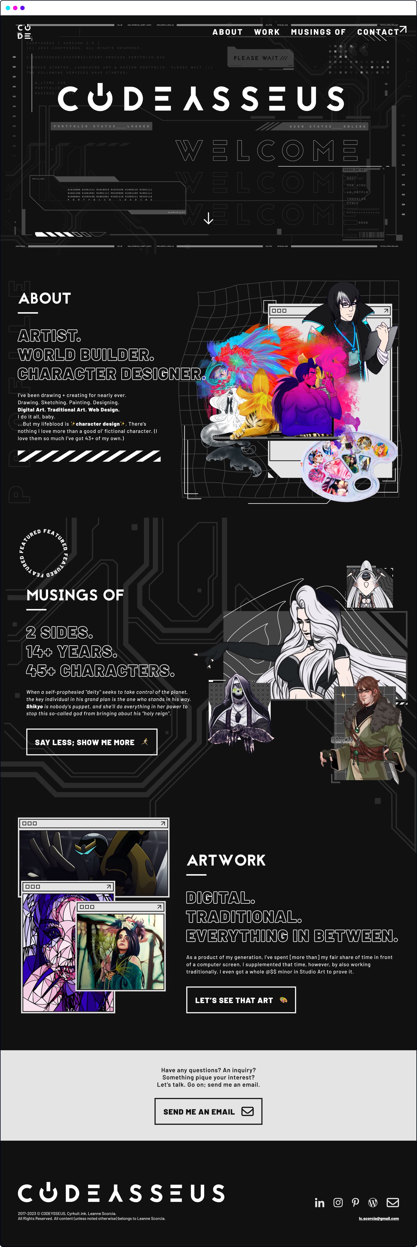 C0DEYSSEUS is my online presence. It's my persona, my art & design presence, my art handle on just about every social media website, and (hopefully, one day) my Twitch channel. For the purposes of this case study, we'll be focusing on c0deysseus.com — my aforementioned art & design portfolio.