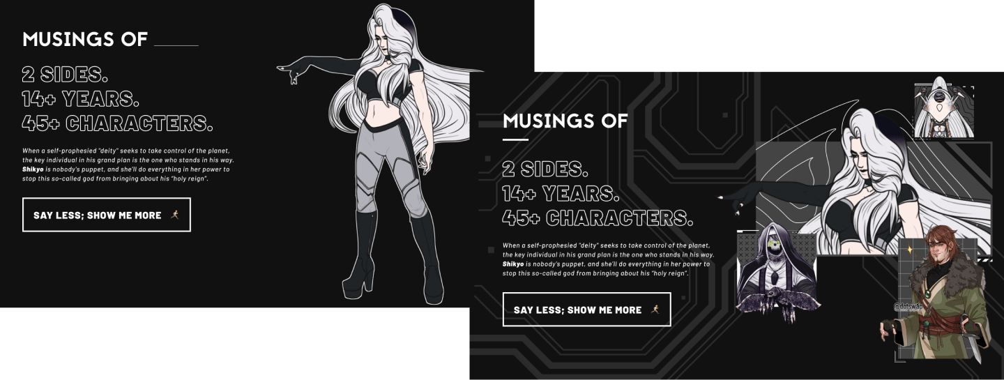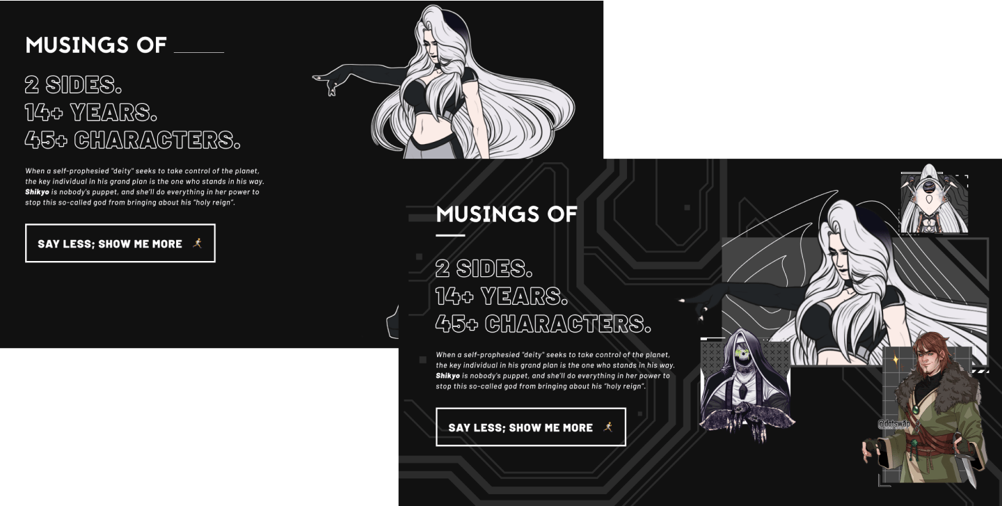 When I first built c0deysseus.com, the âthing to doâ was keep visitors up-to-date with new content â and to lead them towards said content. This works well... when the website isnât updated and maintained by a single person. Or at least works well if that single person updates the site regularly. Since I didnât have a blog dedicated to this website â and I only added to my character pages once every *cough* eight months *cough* â I realized that the âWhatâs Newâ item wasnât worth keeping. I also realized that I could repurpose that real estate to showcase the item I truly care about: Musings Of.